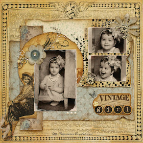 На этой страничке оформила фото Поли из нашей студийной фотосессии годичной давности. Винтажный образ прекрасно дополнила бумага Graphic45 и несколько листов GSD Studio; украшения Prima и WP. Также использовала фоновый штамп Ольги Котляровой "Стрекозы".